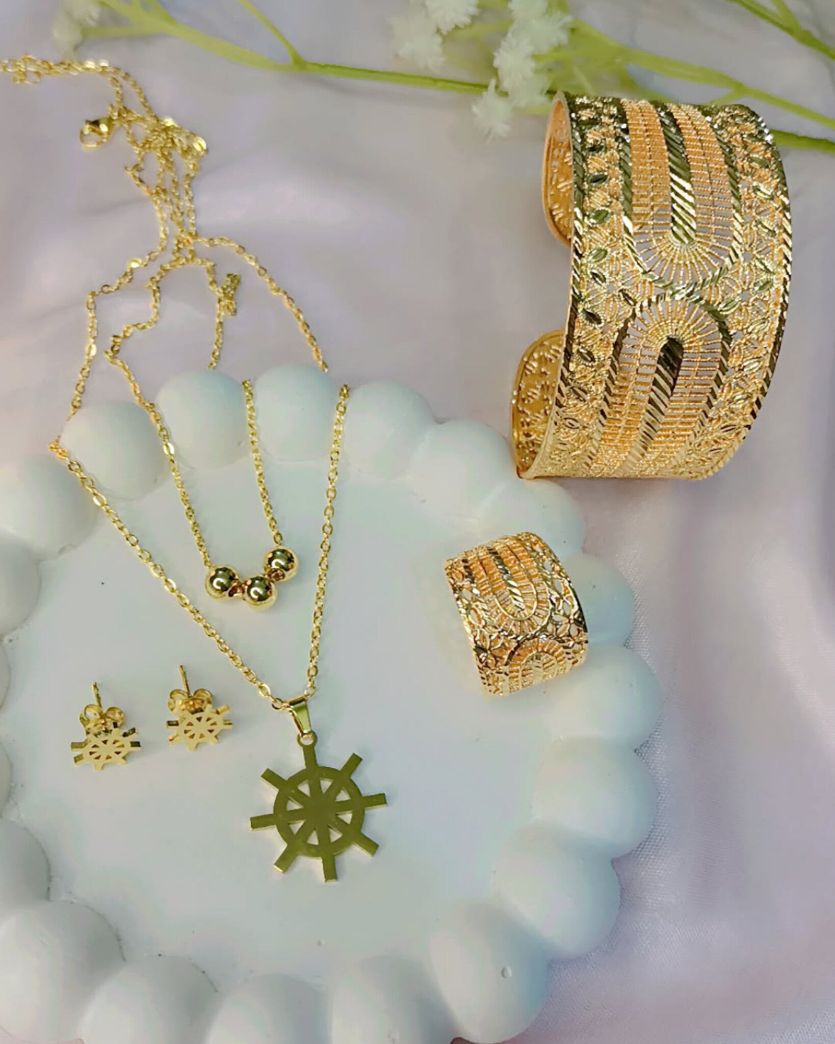 This luxurious set includes a gold-plated necklace with a unique wheel-shaped pendant, matching stud earrings, a wide handcuff bracelet, and a statement ring — all crafted from premium stainless steel for lasting brilliance.